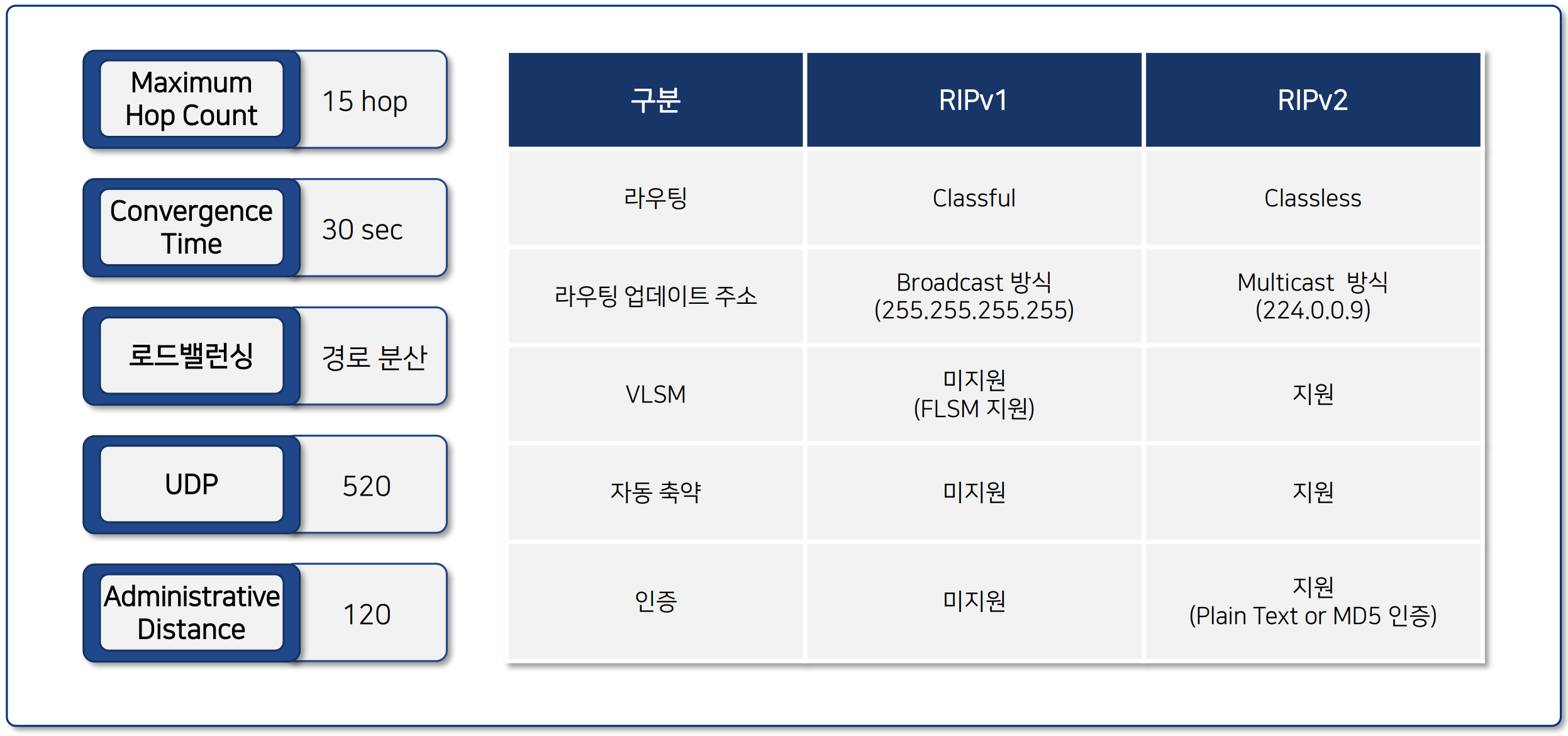 - 홉 수를 기준으로 최단 경로를 선정하는 동적 라우팅 프로토콜