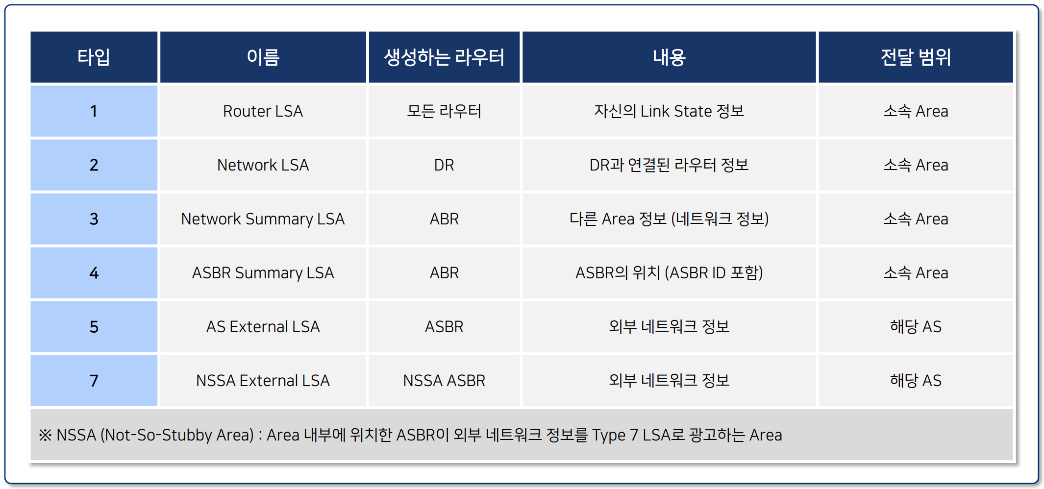 - LSA (Link State Advertisement) : "지금 내 Link State 정보는 어떻고, 다른 Area로 가는 경로는 어디고..."
