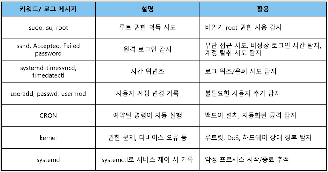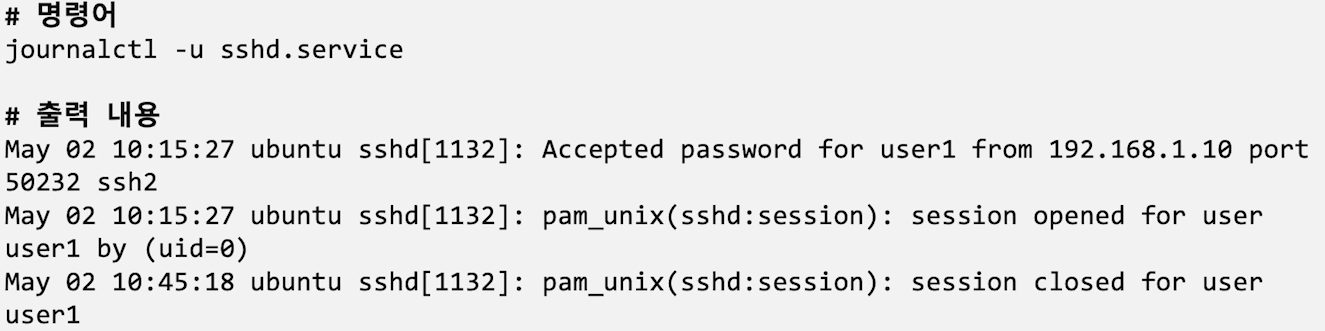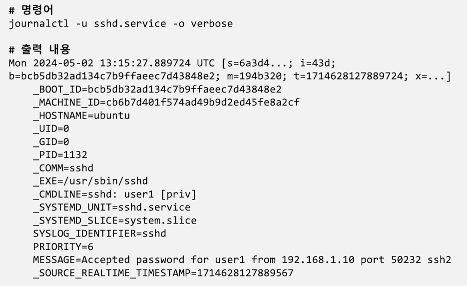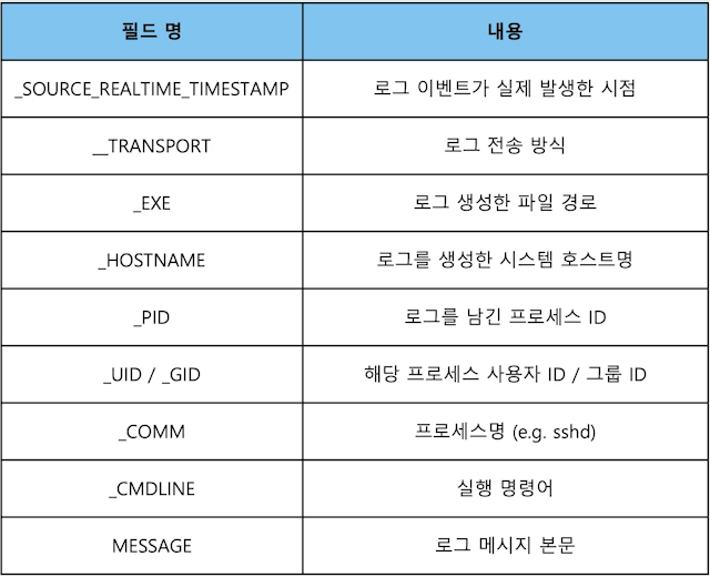 journald는 로그인, 서비스 동작, 인증 실패 등 운영 전반에서 발생하는 보안 이벤트를 광범위하게 기록한다.