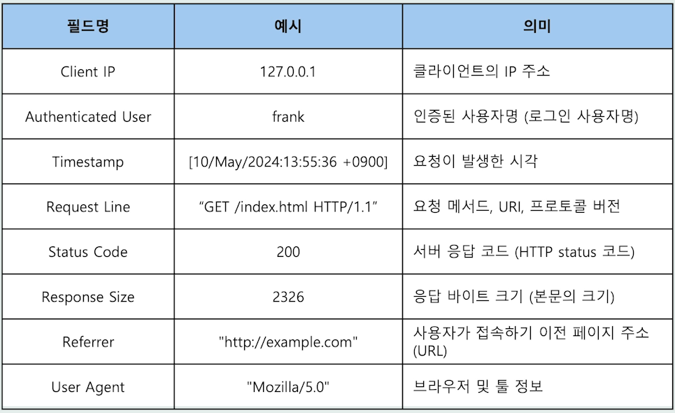 Apache 로그는 Combined Log Format형식으로 로그를 기록한다. 여러 웹 서버 및 분석 도구들이 일관되게 이해할 수 있도록 만든 공통 구조에 Referer와 User-Agent를 추가한 형태이다.