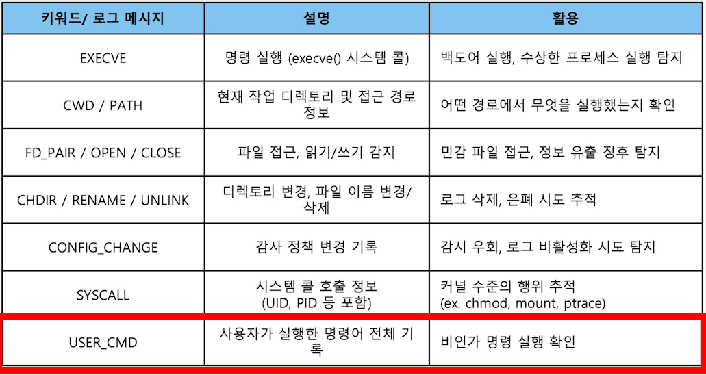 그래서 auditd는 리눅스 커널 수준에서 보안 이벤트들을 추적하고 로그를 생성하는 감사 시스템이다. 누가, 언제, 어떤 리소스에 접근했는가를 정확하게 기록하는데 특화 되어있다.