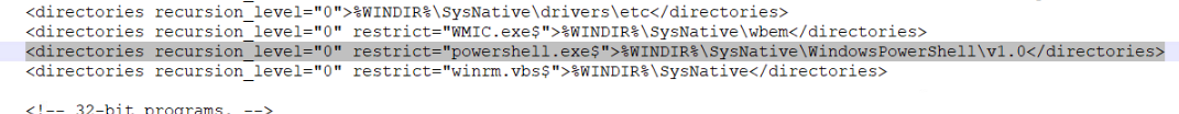 해당 powershell.exe 부분을 보면, powershell.exe 뒤에 $는 헤당 디렉토리 안에서 powershell.exe만 감시 대상으로 지정한다는 의미다. 이런 기능은 감시 범위를 세밀하게 조정하는데 유용하다. 이를 사용하지 않으면 System32같은 많은 파일들을 갖고있는 폴더에서 무결성 체크에 불필요하게 리소스를 잡아먹을 수 있다.