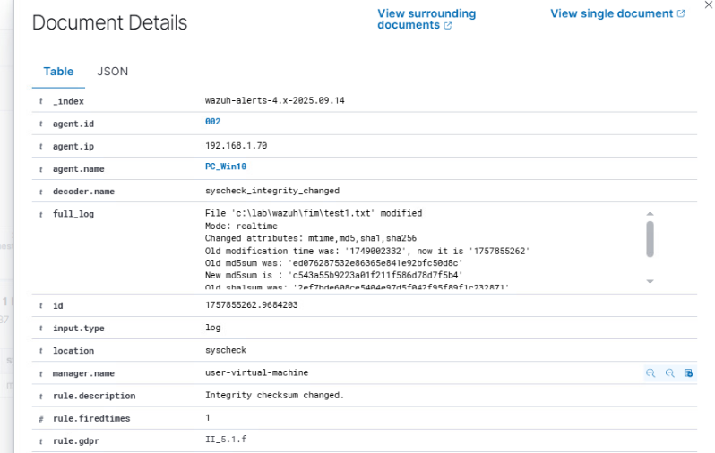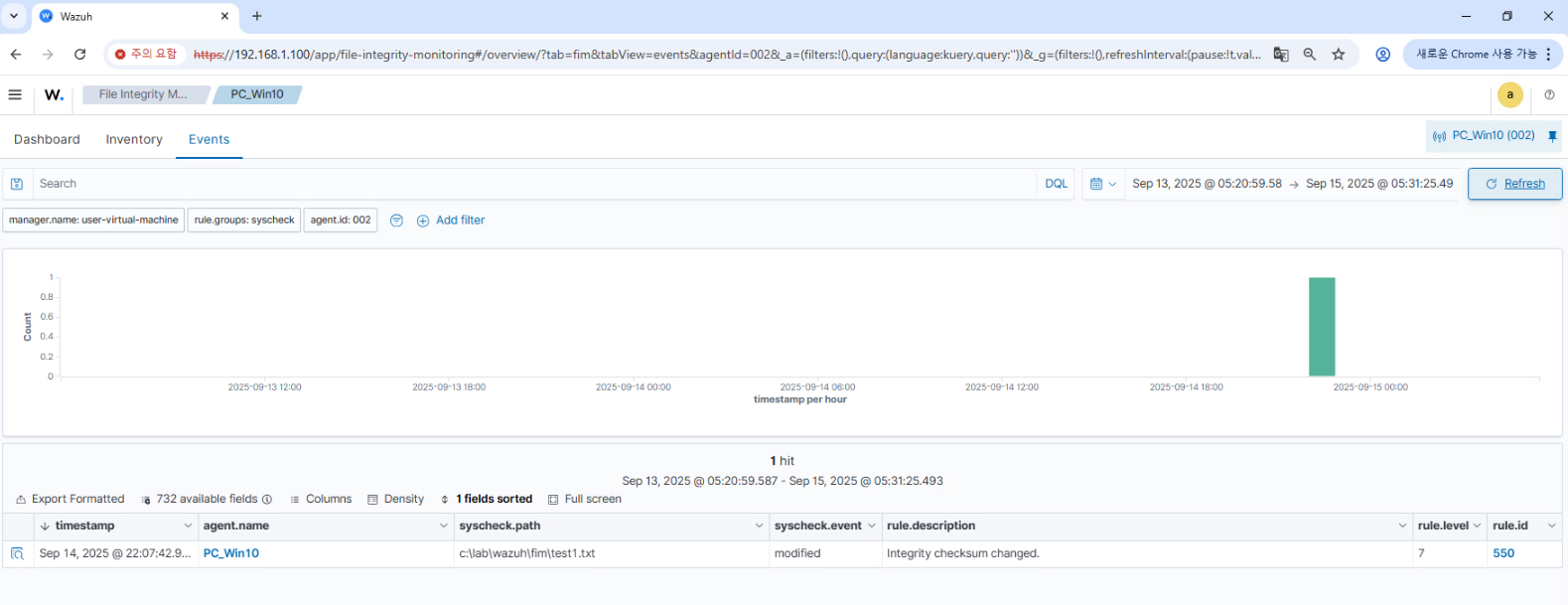 탐지된 이벤트가 Wazuh 대시보드 상에서 어떻게 표시되고, 어떤 정보를 제공하는지도 함께 확인한다.