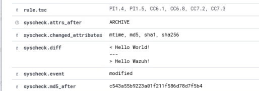 - 해당 옵션이 적용된 환경에서는 syscheck.diff 필드에서 파일 내부의 변경 사항을 확인할 수 있다.