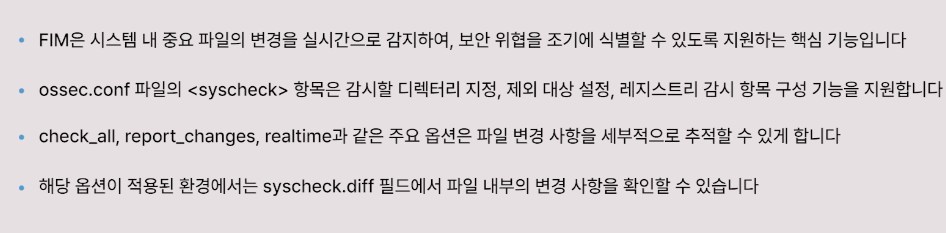 - FIM은 시스템 내 중요 파일의 변경을 실시간으로 감지하여, 보안 위협을 조기에 식별 가능한 핵심 기능이다.